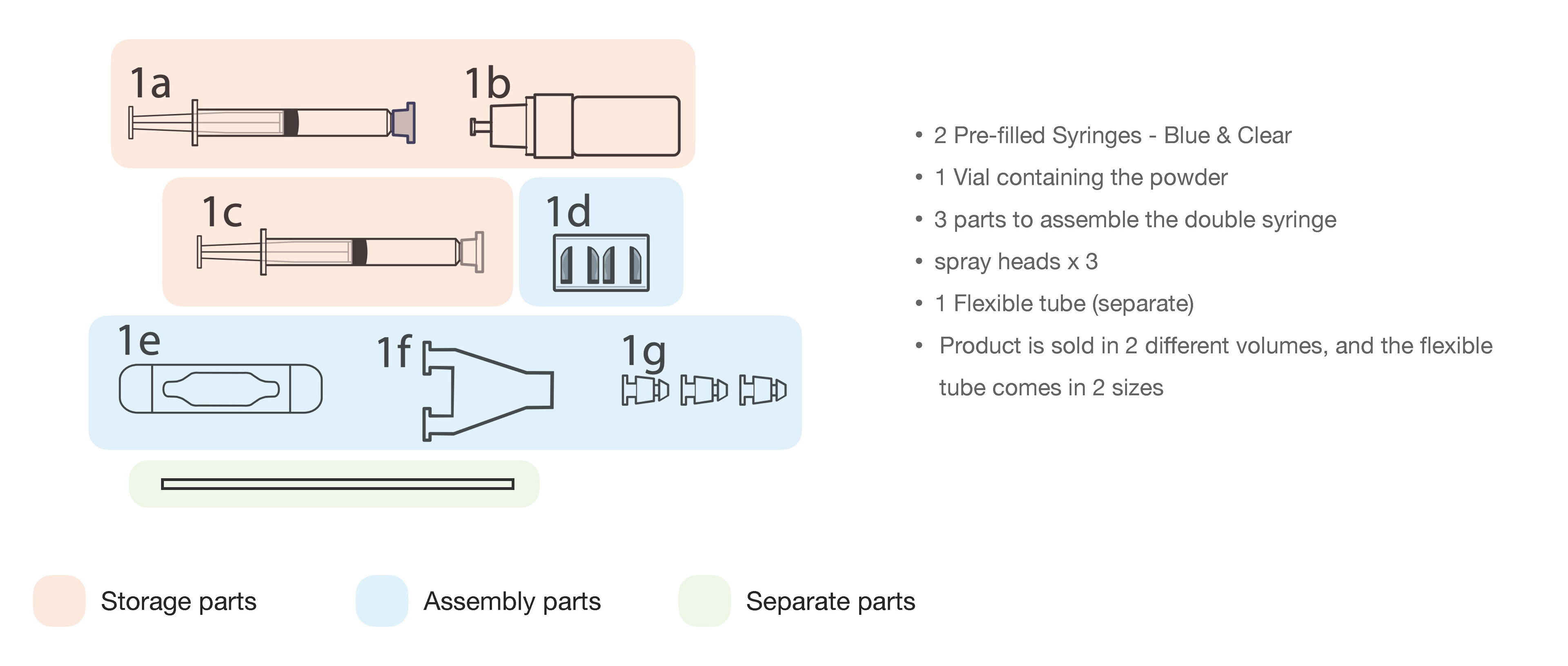 Step 1 : Assemble the powder vial and the the blue fluid vial onto the syringe set.