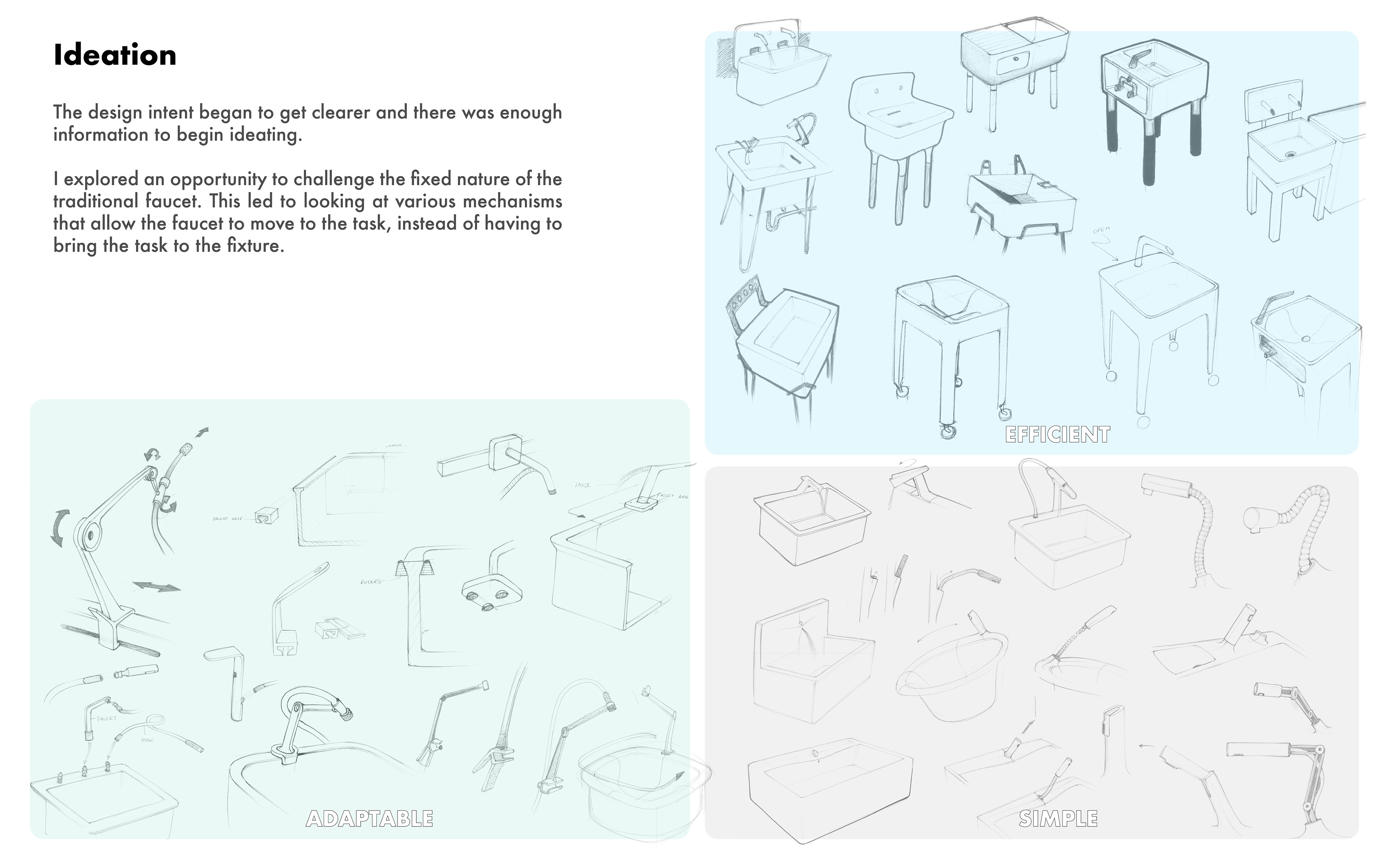 I looked at various magnetic and mechanical systems to facilitate the movement and sketched out product ideas. Based on reviews with the faucet and kitchens teams, the Sliding Faucets were selected for further development.